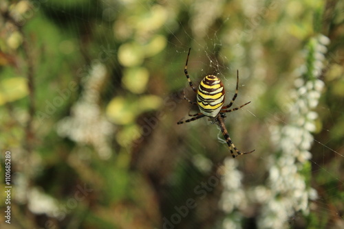 Wasp spider (Argiope bruennichi) on web. Black and yellow stripe. Large, colorful spider
