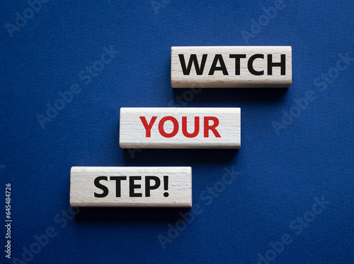 Watch your Step symbol. Concept words Watch your Step on wooden blocks. Beautiful deep blue background. Business and Watch your Step concept. Copy space.