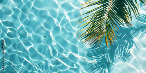 Water and sand surface with tropical palm leaves shadow. Green palm leaf shadow on white sand beach of an ocean shore. Tropical background for summer vacation at the beach. Calm sea, perfect vacation