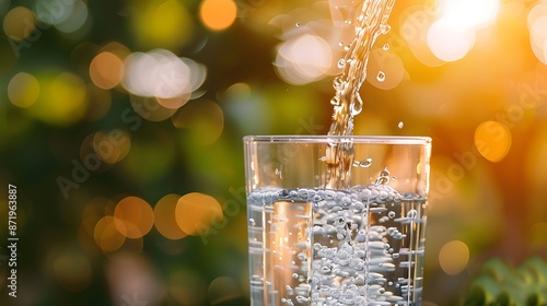 Water being poured into a glass, focusing on the water and glass with a blurred background of greenery and sunlight. freshness and healthiness associated with drinking clean or spring-like water.