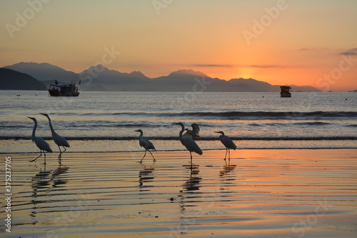 water birds on the beach during sunset, orange scene