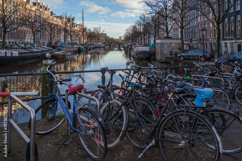 water canals in Amsterdam with a bridge in the middle and traditional architecture with bicycles