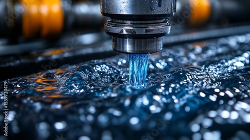 Water cascades from a cutting tool, creating captivating ripples in a dynamic blue visual display