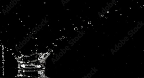 Water Crown Splash on Black Background with Droplets Suspended in Air
