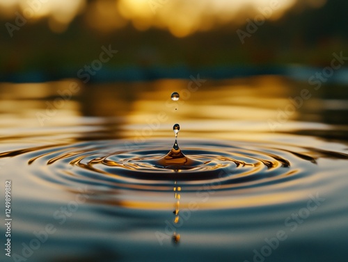 Water drop impact, sunset ripples, nature scene, calm background, design element