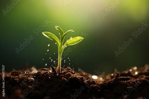 Water drop on newly planted sprout outdoors nature soil.