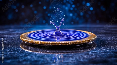 Water Drop Splashing in Blue and Gold Dish with Bokeh Background