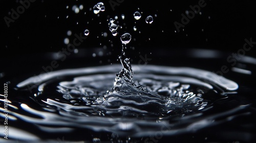 Water droplet splash captured mid-air, illustrating fluidity and texture on a black background.