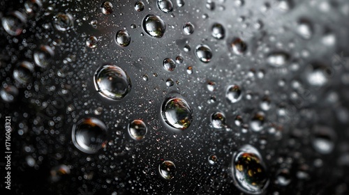 Water droplets cling to a dark, textured surface, reflecting light with clarity and depth