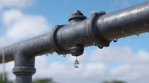Water droplets falling from a weathered metal pipe system against a bright blue sky with clouds