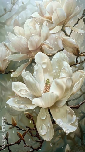 Water droplets on magnolia flower blossom petal.
