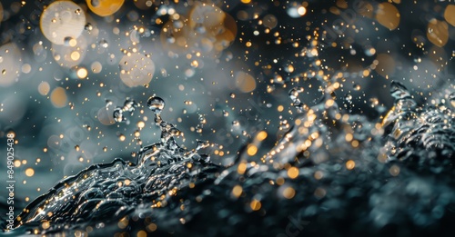 water droplets suspended in mid-air, caught in a moment of fluidity and elegance. The droplets form intricate patterns against a dark background, illuminated by soft, diffused light.