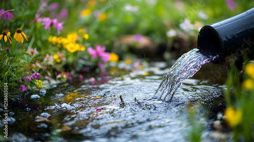 Water Flowing from Pipe into Sparkling Stream Surrounded by Flowers