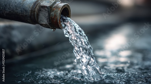 Water flows from a metal pipe outdoors creating ripples and splashes.