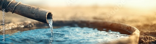 Water flows from a rustic pipe into a round container, creating ripples in a serene outdoor setting.