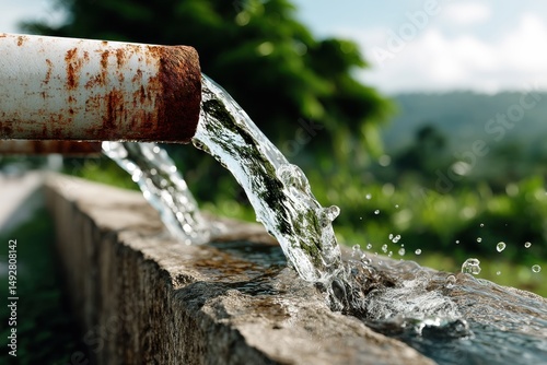 Water flows from an old pipe into a tranquil stream surrounded by lush greenery