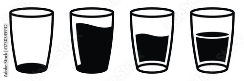 Water glass icon set in black color. Set of glass of water flat icon set. Glasses water level. Vector illustration.