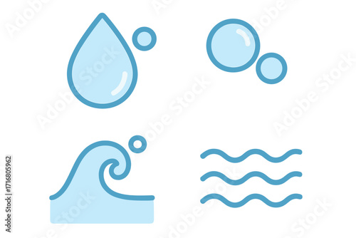 Water icon set vector cartoon illustration. Minimalist aqua themed icons with bubble and wave elements. Liquid drop, sea, ocean flow symbol collection. Clean flat design.
