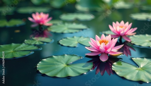 Water lilies & lotus blossoms form intricate pattern on calm lake surface, summer, pond, stockphoto