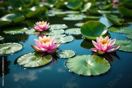 Water lilies forming a natural floral pattern across a still lake, floral, flora, landscape