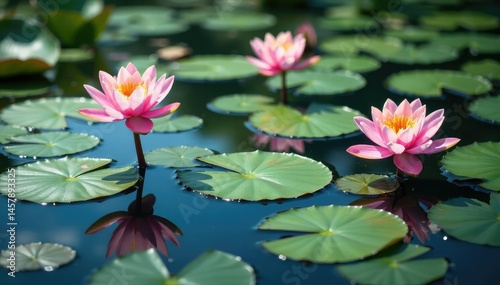 Water lilies forming a natural floral pattern on a lake surface, design, blue