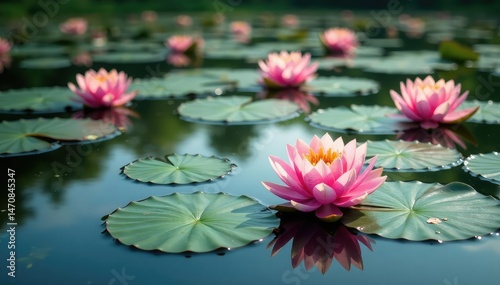 Water lilies forming a repeating pattern across a still lake, floral design, green, botanical