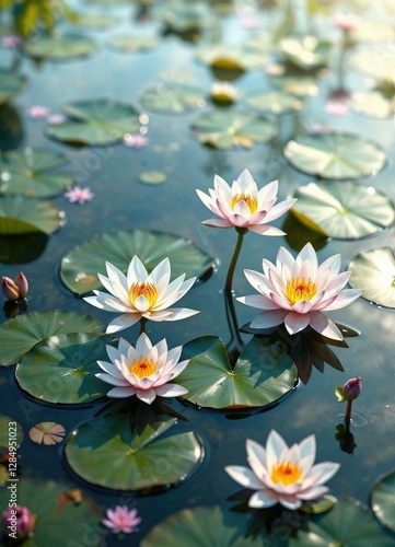 Water lily and jasmine together floating on a peaceful pond , jasmine, pond
