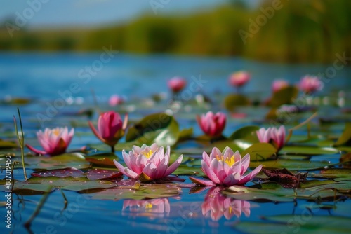 Water lily flowers at a calm lake