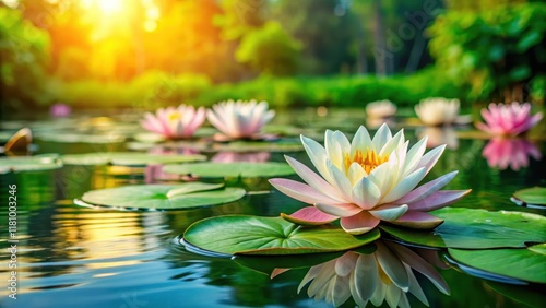 Water lily flowers with green leaves floating on a serene lake surface , natural beauty, relaxation