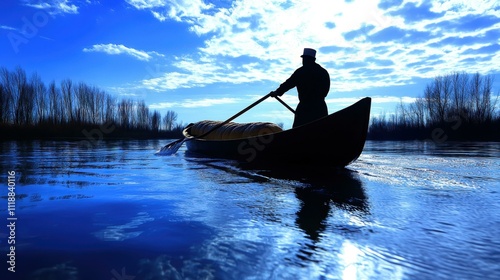Water positive Esg fintech nature-based forebears Longtermism Decarbonization EcoVadis skipperi Paddle.com Aidash Silhouette of a man rowing wooden boat on calm river during sunset with blue sky and