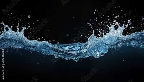 Water splash art. Liquid movement in mid air. Dynamic wave and ripple effects. Clear and transparent water. High speed action. Isolated on a black background. Artistic and elegant design.