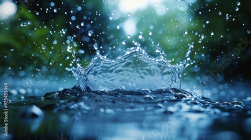 Water splash on a rock during a rainstorm. A crown of water droplets with a blurred background of green foliage and light.