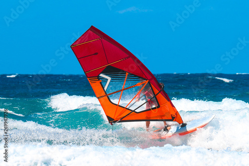 water sports: windsurfer with red and orange sail riding the waves during a sunny summer afternoon.