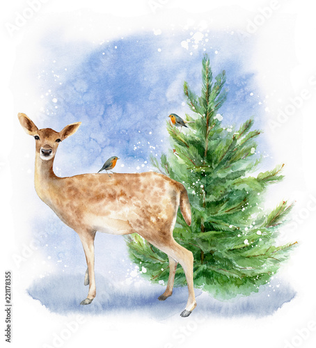 Watercolor abstract forest background. Deer and Robin bird. Winter landscape. Background template for design posters, wedding invitations, postcards and more