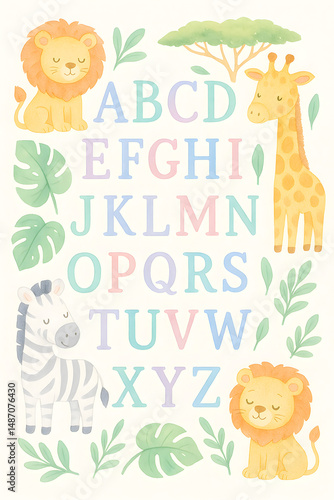 Watercolor alphabet chart with pastel safari animals including lion, giraffe, and zebra, surrounded by tropical leaves and soft jungle trees, perfect for nursery or classroom decor