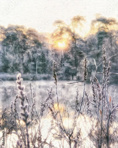 Watercolor and pastel drawing Finland nature landscape, mystical foggy forest, autumn trees trend popular print for poster, textile or canvas. Modern fine arts design wallpaper. Wall art oil painting