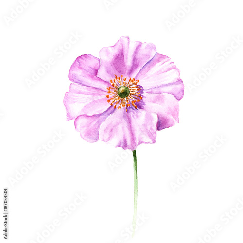 Watercolor anemone flower. Hand drawn single flower isolated on white background. Artistic floral element. Botany illustration