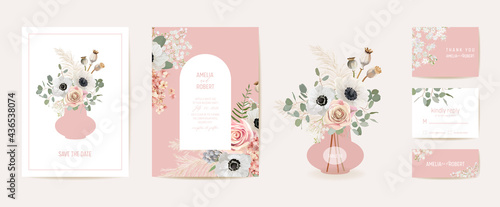 Watercolor anemone, pampas grass, rose floral wedding card. Vector summer flowers invitation
