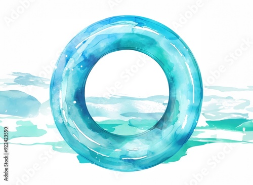 Watercolor artwork of a blue swim ring floating on water with gentle waves and splashes, evoking a relaxed summer vibe. ai