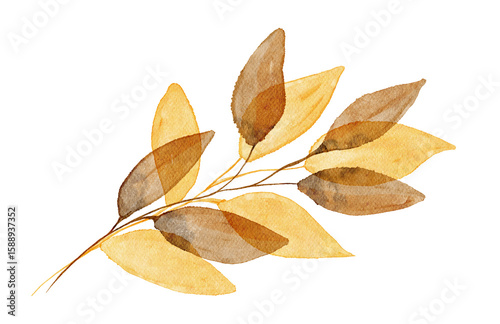 Watercolor Autumn Leaf Isolated Fall Leaves Branch Design Element in Yellow and Orange Vibrant Colors on Transparent Background, Hand Painted Illustration