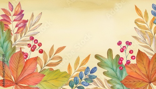 Watercolor autumn leaves and berries. Floral background.