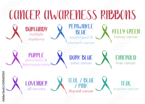 Watercolor awareness ribbons. Different color set of cancer ribbon, isolated on white background.