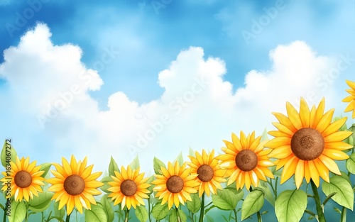 Watercolor background with sunflowers and white clouds onblue sky. High quality