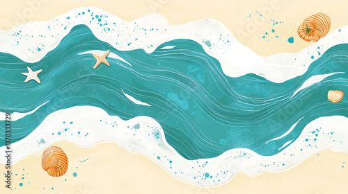 Watercolor beach scene with turquoise waves, seashells, and starfish, creating a relaxing, coastal atmosphere perfect for ocean-themed art, summer, beach illustrations, and serene backgrounds.