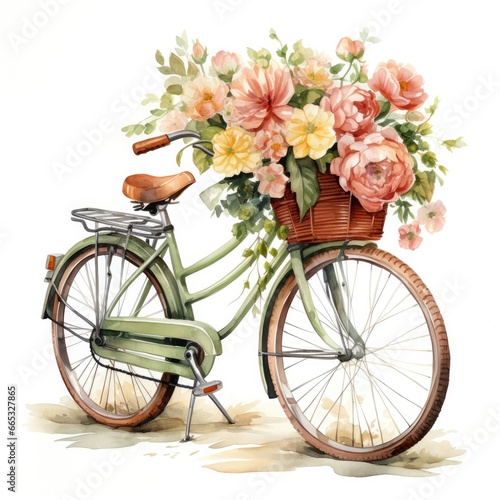 Watercolor bicycle with flowers in the basket isolated on white background.