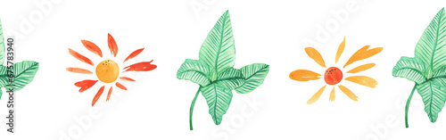 Watercolor botanic, Leaf and flower border. Seamless herbal composition for greeting card. Spring Border with leaves and flower isolated on white backgrond.