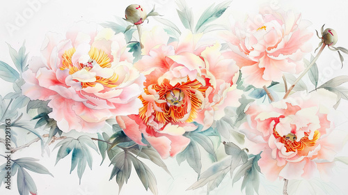 Watercolor botanical illustration of peonies using layering (glazing), soft pastel blending, white background
