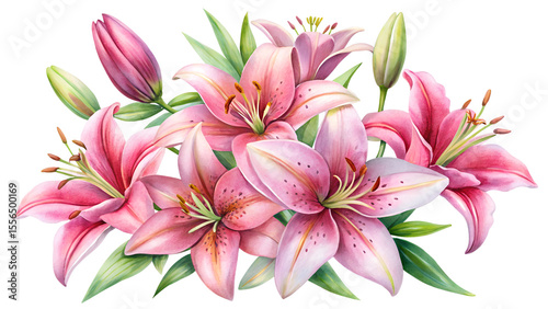 Watercolor bouquet of pink lilies isolated on transparent background