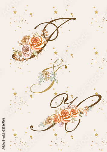 Watercolor brown alphabet with ?boho flowers of beige peach roses and leaves. Monogram initials are perfect for a wedding invitation, greeting card, logo, poster. Festive hand-painted decorations