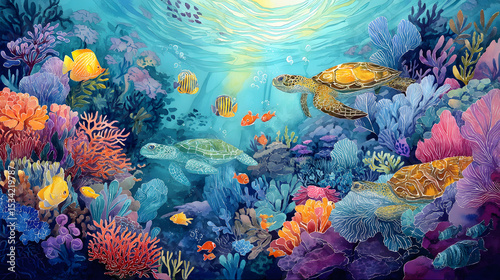 watercolor Cartoon underwater tropical coral reef